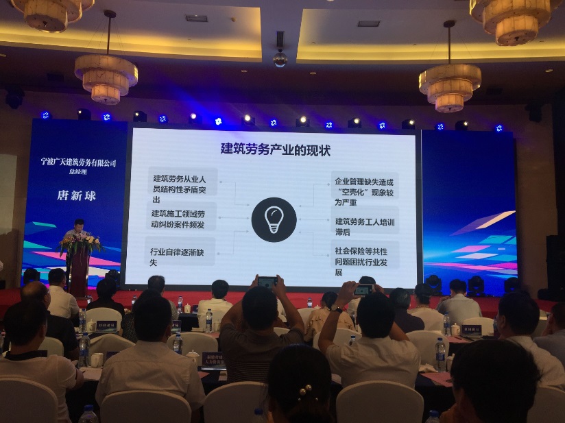 廣天勞務(wù)總經(jīng)理唐新球有幸作為寧波勞務(wù)企業(yè)家代表作了發(fā)言,以“政企合力促轉(zhuǎn)型,創(chuàng)新平臺引發(fā)展”為主題,提出打造以建筑勞務(wù)產(chǎn)業(yè)園為依托,培養(yǎng)建筑產(chǎn)業(yè)工人,打造“互聯(lián)網(wǎng)+”勞務(wù)用工平臺,抓住建筑勞務(wù)產(chǎn)業(yè)普遍面臨的痛點,打造一系列服務(wù)平臺的思路。