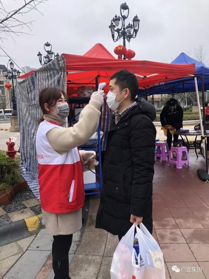 廣宜集團(tuán)志愿者在湖西社區(qū)為居民測量體溫